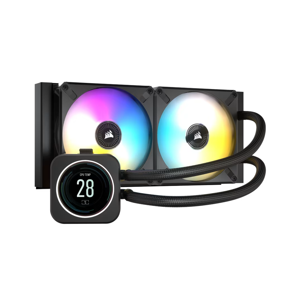 The CORSAIR iCUE H100i ELITE LCD Display Liquid CPU Cooler delivers powerful, customized cooling for your CPU, with a personalized LCD screen and two cutting-edge CORSAIR ML120 RGB ELITE PWM fans.