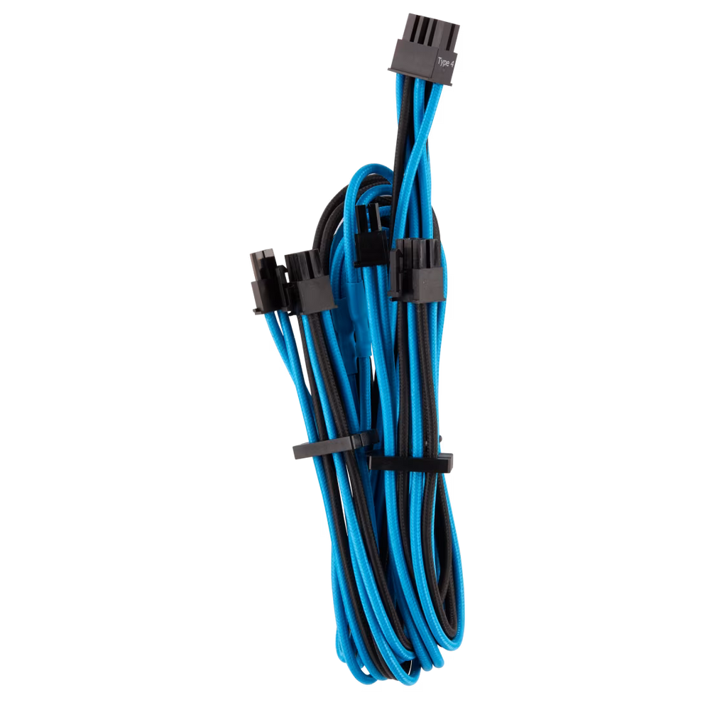 The CORSAIR Premium Individually Sleeved PCIe Type 4 Gen 4 cables combine premium paracord sleeving and a heatshrink-less finish with wide compatibility for CORSAIR Type 4 Power Supplies.